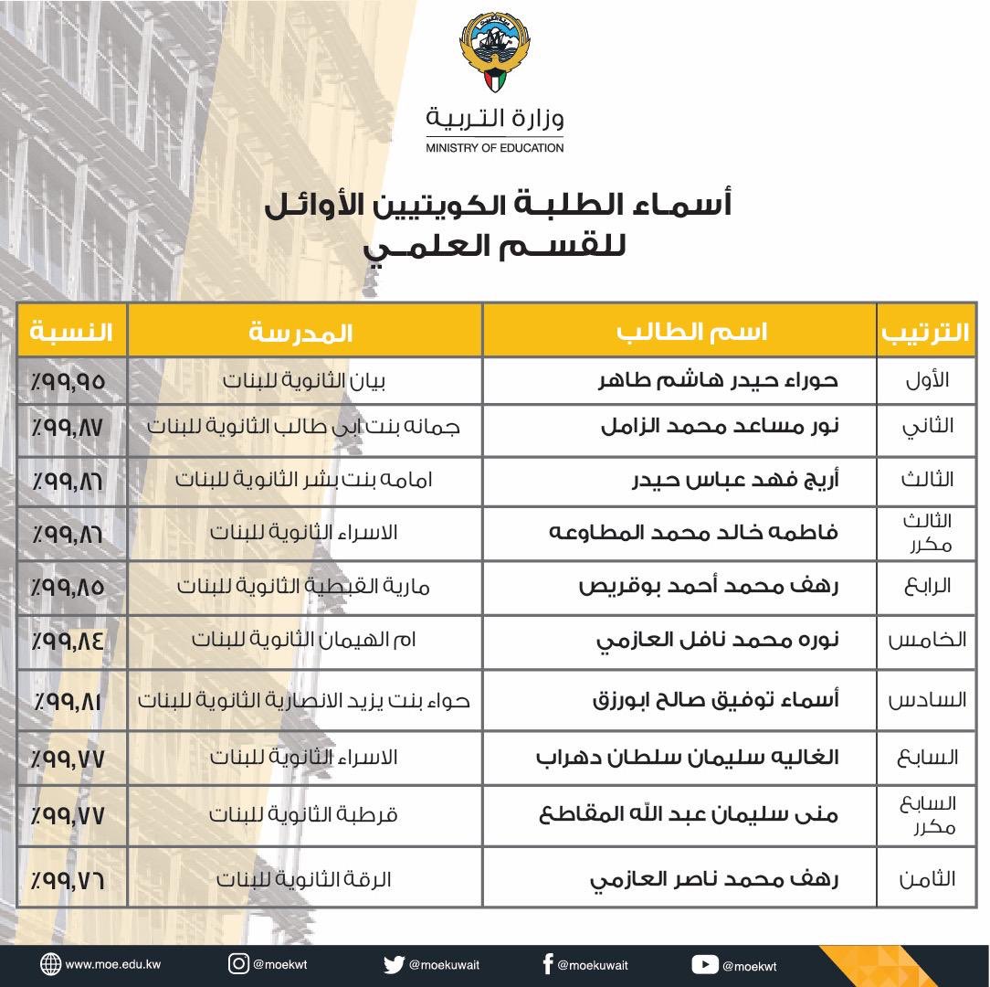 أسماء الناجحين نتائج الثانوية العامة 2020 الكويت. أوائل القسم العلمي للصف الثاني عشر هم. موعد تكريم اوائل الثانوية العامة 2020 الكويت. اسماء المقبولين في البعثات الداخلية 2020 الكويت بعد الإنتهاء من دراسة الثانوية العامة في جميع مدارس الكويت وبظهور نتائج الطلبة المتفوقين تقوم دولة الكويت بمنح هذه الفئة من الطلاب على منح لإستكمال دراساتهم وللقيام. من المقرر أن يكون هناك تكريم يليق بمستوى الطلاب و الطالبات الحاصلين علي أعلي نسب في شهادة الثانوية العامة 2020 الكويتية و تسليمهم جائزة من قبل وزير التعليم في حفل أو في المنزل و من المتوقع أن يكون ذلك بعد أن تنتهي فترة النتيجة.