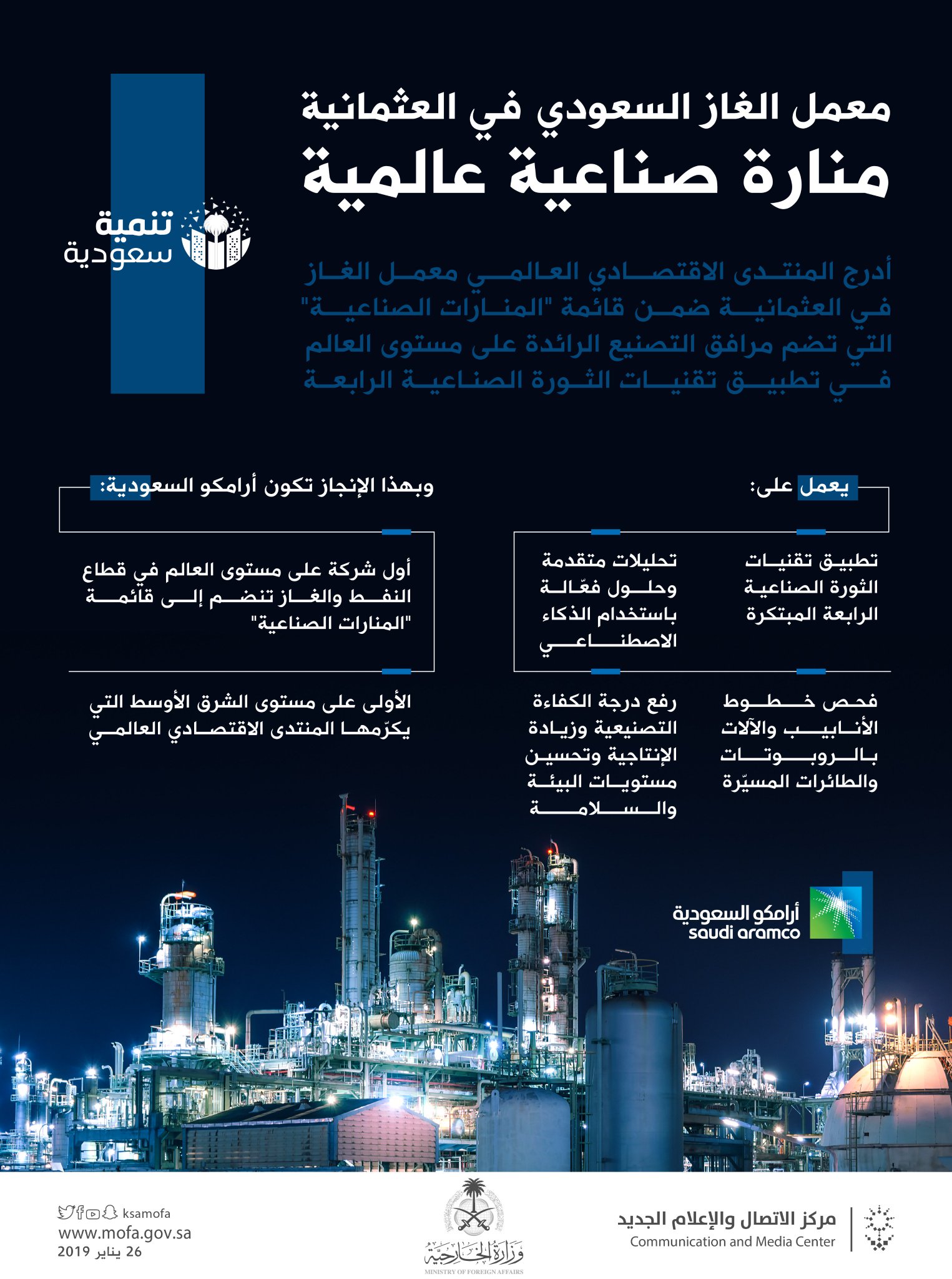 المنتدى الاقتصادي العالمي يحتفي بمعمل أرامكو السعودية للغاز في العثمانية أخبار الظهران يناير 21 2019. وتمثل إضافة معمل واسط إلى مجموعة أعمال أرامكو السعودية زيادة كبيرة في قدرتها لمعالجة الغاز. أعلنت أرامكو السعودية ومعهد اقتصاديات الطاقة الياباني ieej بالشراكة مع الشركة السعودية للصناعات الأساسية سابك نجاح إنتاج وتصدير أول شحنة من الأمونيا الزرقاء من السعودية إلى اليابان بدعم من وزارة الاقتصاد. وي عد معمل الغاز في العثمانية من أكبر معامل معالجة الغاز في العالم.